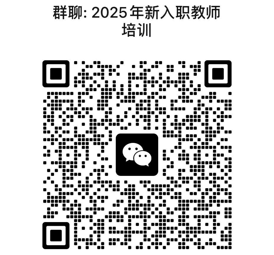 开班仪式及后续培训课程的具体时间、地点将根据实际情况确定,并通过微信群发布。请各单位通知参训加入“2025年新入职教师培训群”,并关注群内通知,群二维码如下。